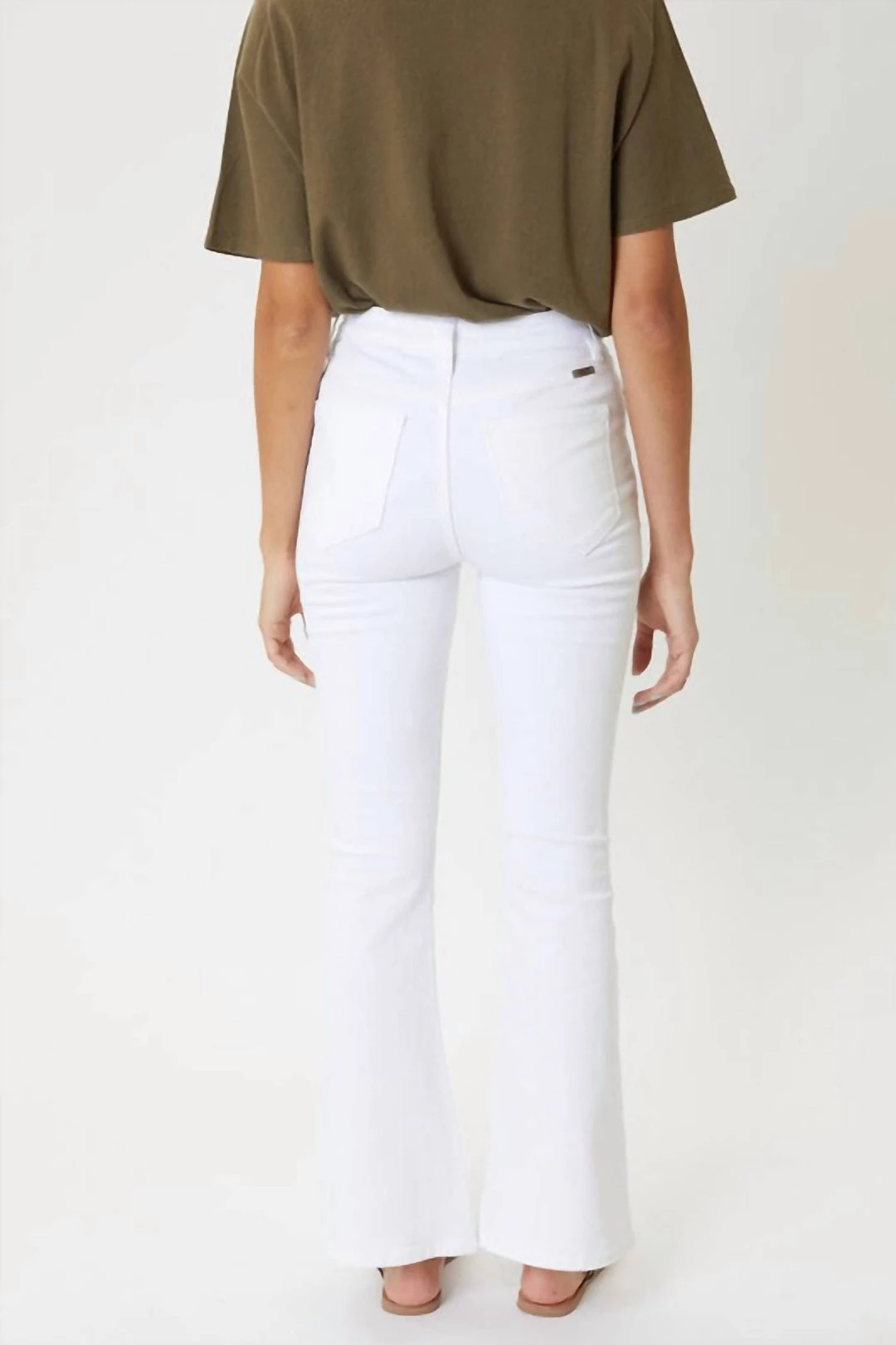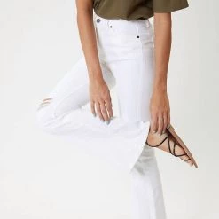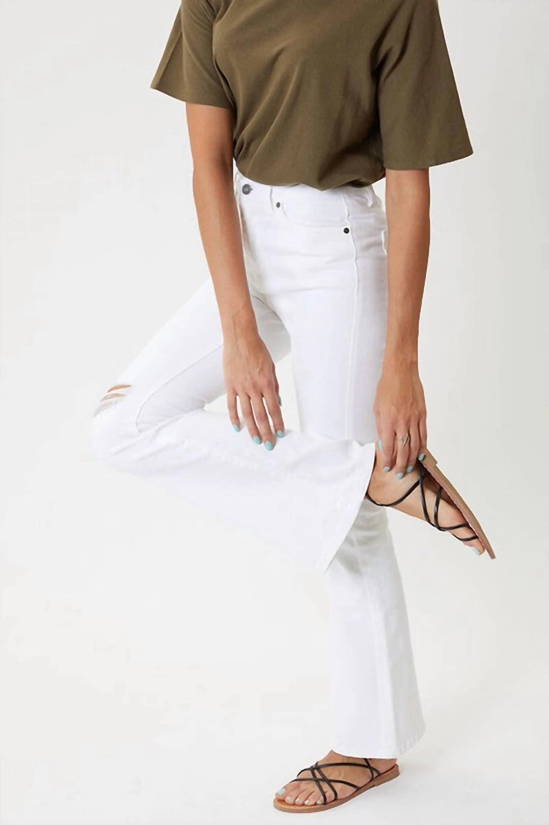 Crisp white cropped bootcut jeans with modern trendy vibe. Featuring waist-accentuating fit, mild fading, whiskering, and unique uneven scattered hem.Regular 5 pockets, Single button closure, Zip Fly11.25″ Rise / 31″ Inseam (Size 26)68.5% Cotton, 23.3% Polyester, 7% Rayon, 1.2% Spandex