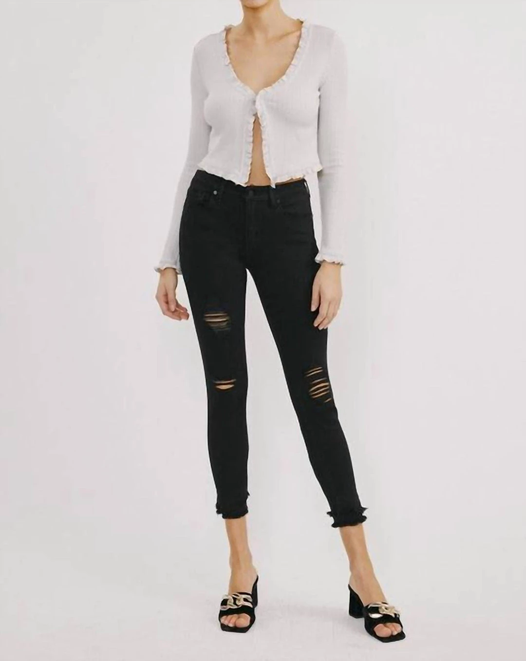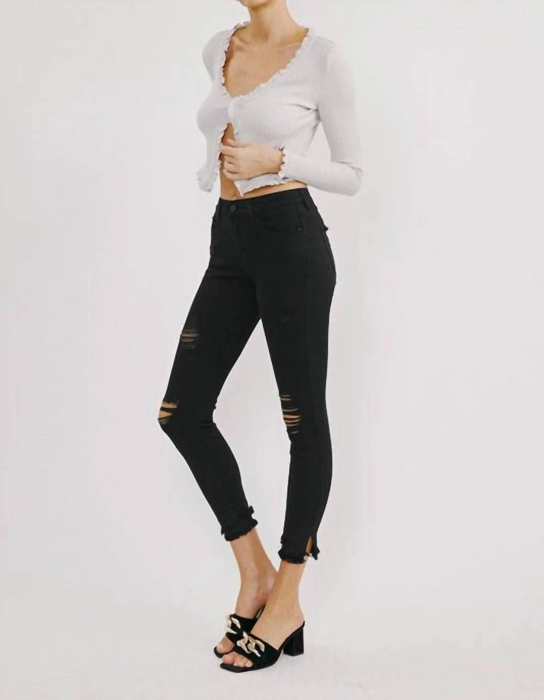 These ankle mid-rise skinny jeans have the best distressing detailsSupper Stretchy and soft. They do not stretch out during wear.ΓΒ 8.5″ RISE, 27″ INSEAM IN SIZE 3