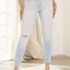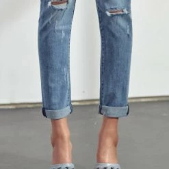 Medium wash with destroy at both knees and folded hemRISE 9.5″INSEAM 27.5″73% Cotton, 14% Rayon, 11% Polyester, 2% Spandex