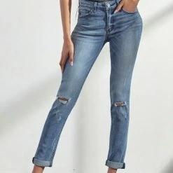 Medium wash with destroy at both knees and folded hemRISE 9.5″INSEAM 27.5″73% Cotton, 14% Rayon, 11% Polyester, 2% Spandex