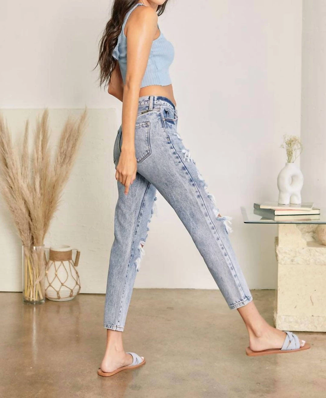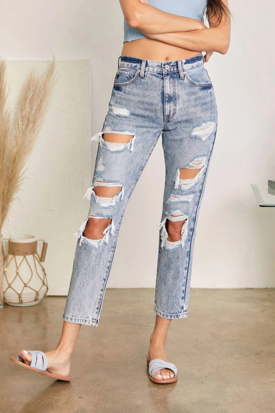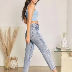 Medium washed relaxed fit non-stretch mom jeans featuring easy tapered fit, heavy distressing detail, mild fading, and whiskering. This jean is modern and trendy and can easily beοΏ½οΏ½worn with flats or heels. Features a classic 5 pocket design, single button front closure, and zip fly.οΏ½οΏ½Regular 5 pockets, Single button front closure, Zip fly10.75″ Rise / 27″ Inseam (In Size 25)100% CottonSIZEWAIST HIP 0 / 23 26″ 35″ 1 / 24 27″ 36″ 3 / 25 28″ 37″ 5 / 26 29″ 38″ 7 / 27 30″ 39″ 9 / 28 31.5″ 40.5″ 11 / 29 33″ 42″ 13 / 30 34.5″ 43.5″ 15 / 31 36″ 45″