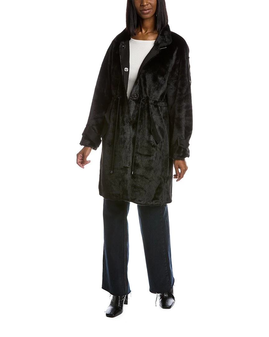 - Design Details – Faux Fur Design, Stand-Up Collar, Raglan Sleeves, Faux Suede Trim, Two Front Pockets, Drawstring Waist