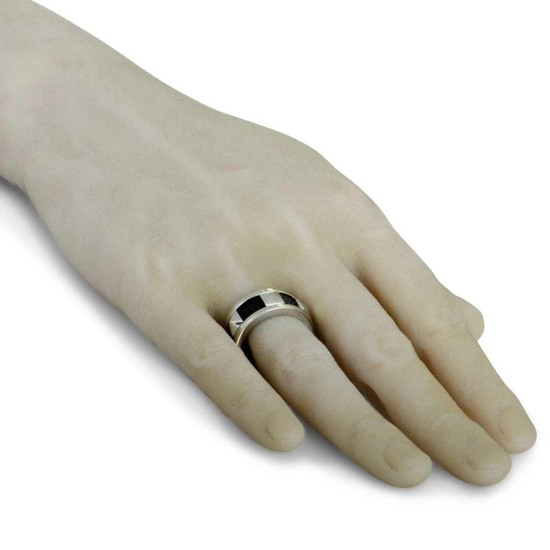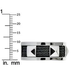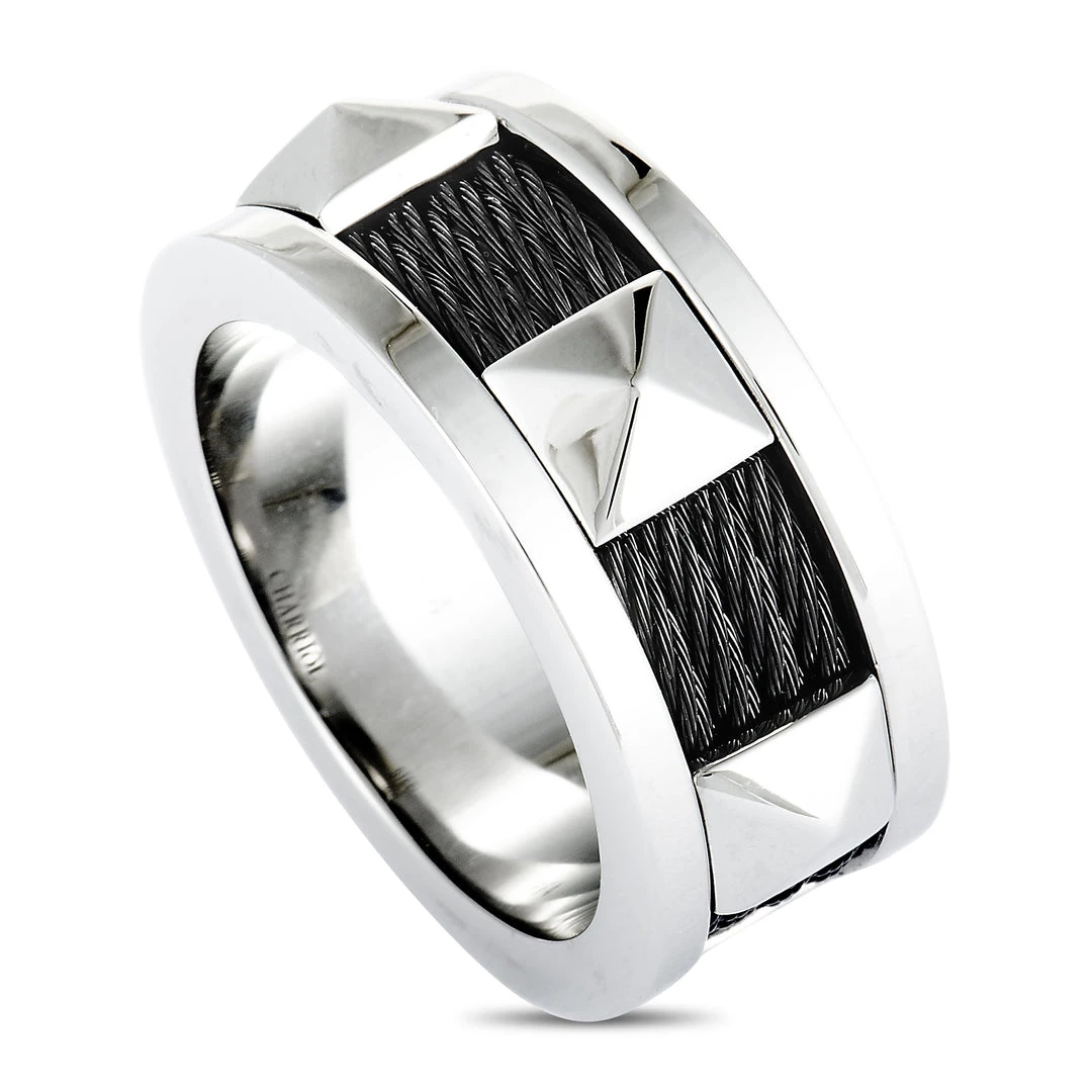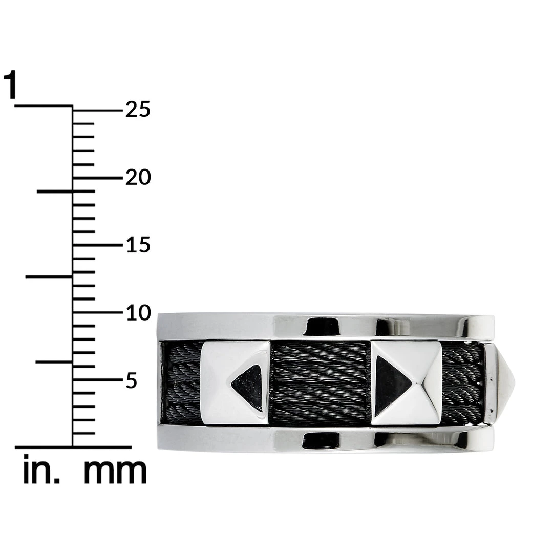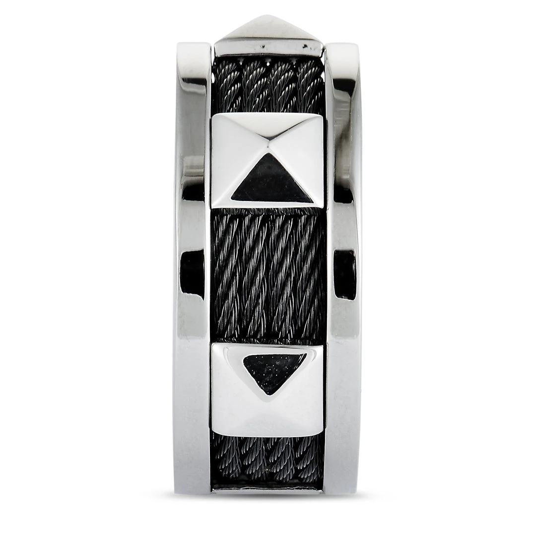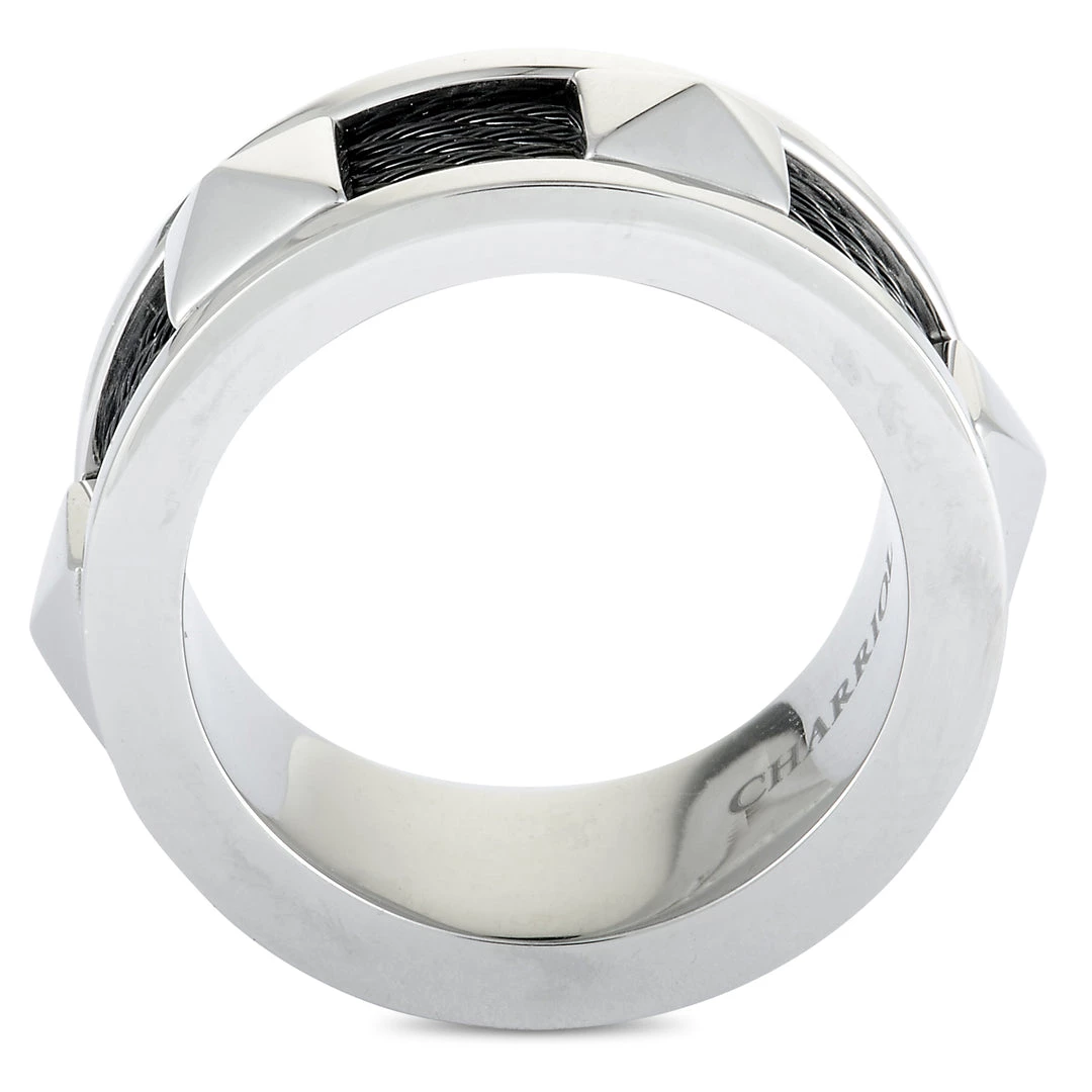 The attractive cable motif in this βForeverβ ring from Charriol is presented in striking black PVD-coated stainless steel and accentuated by bold, expertly crafted studs. The ring weighs 12.1 grams.