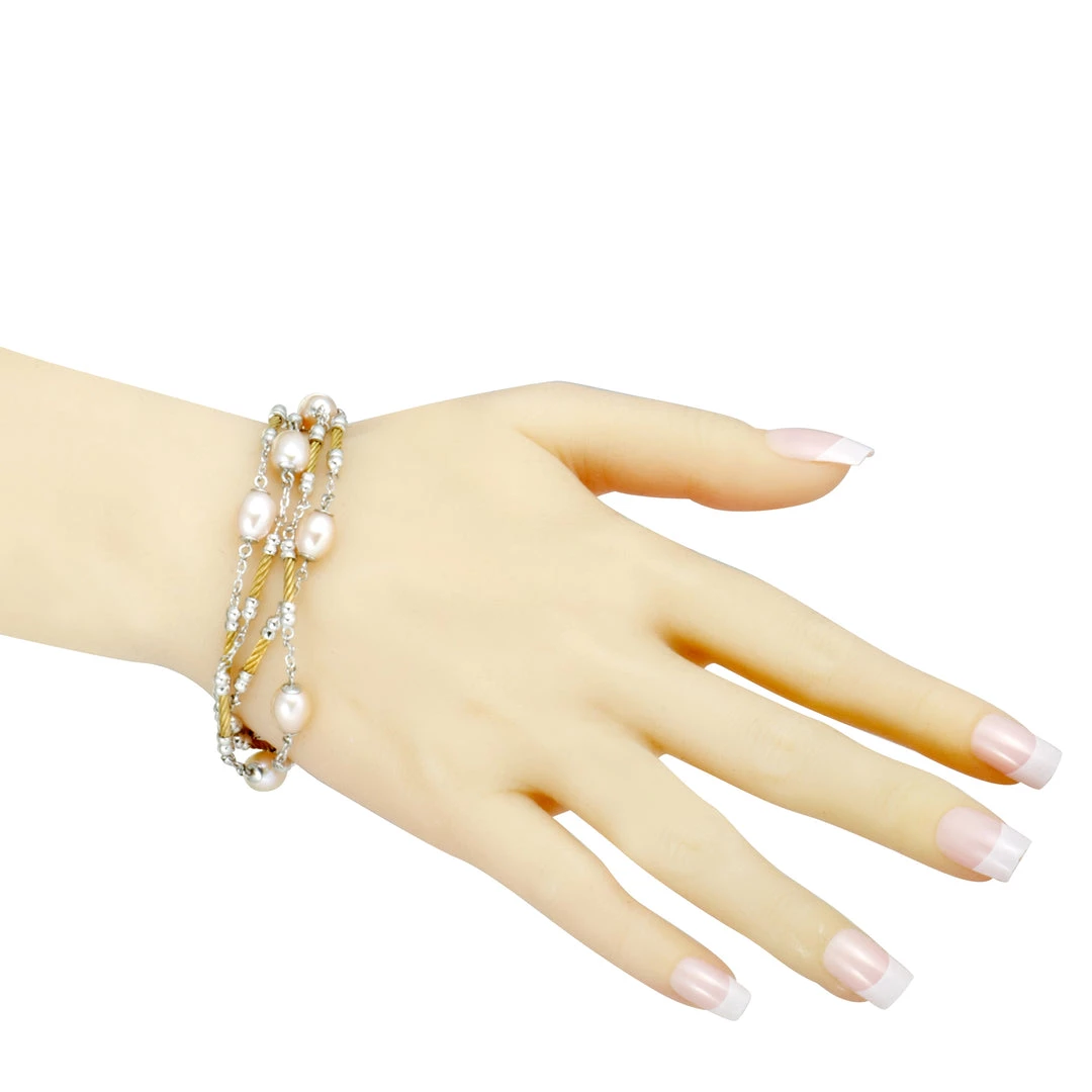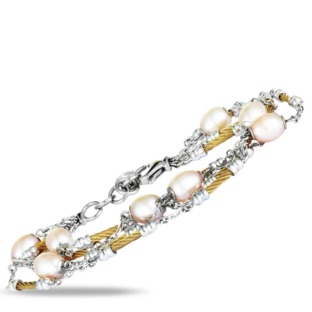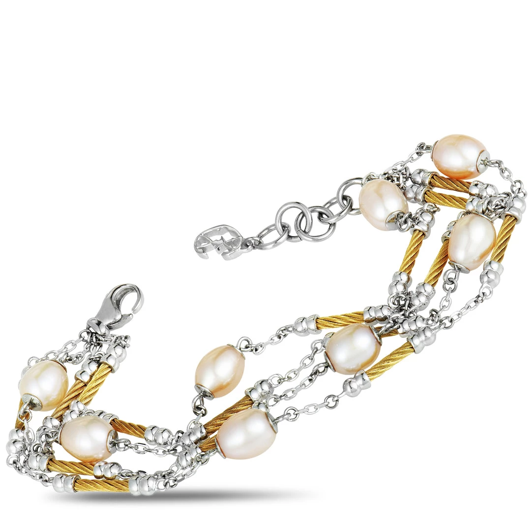 An endearingly sublime look is achieved in this exquisite βPearlβ bracelet from Charriol by combining gleaming stainless steel with radiant yellow PVD-coated cable inserts and topping it all off with alluring cream pearls. The bracelet weighs 22.8 grams.