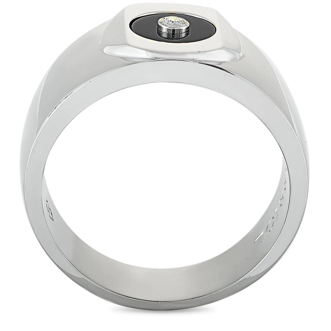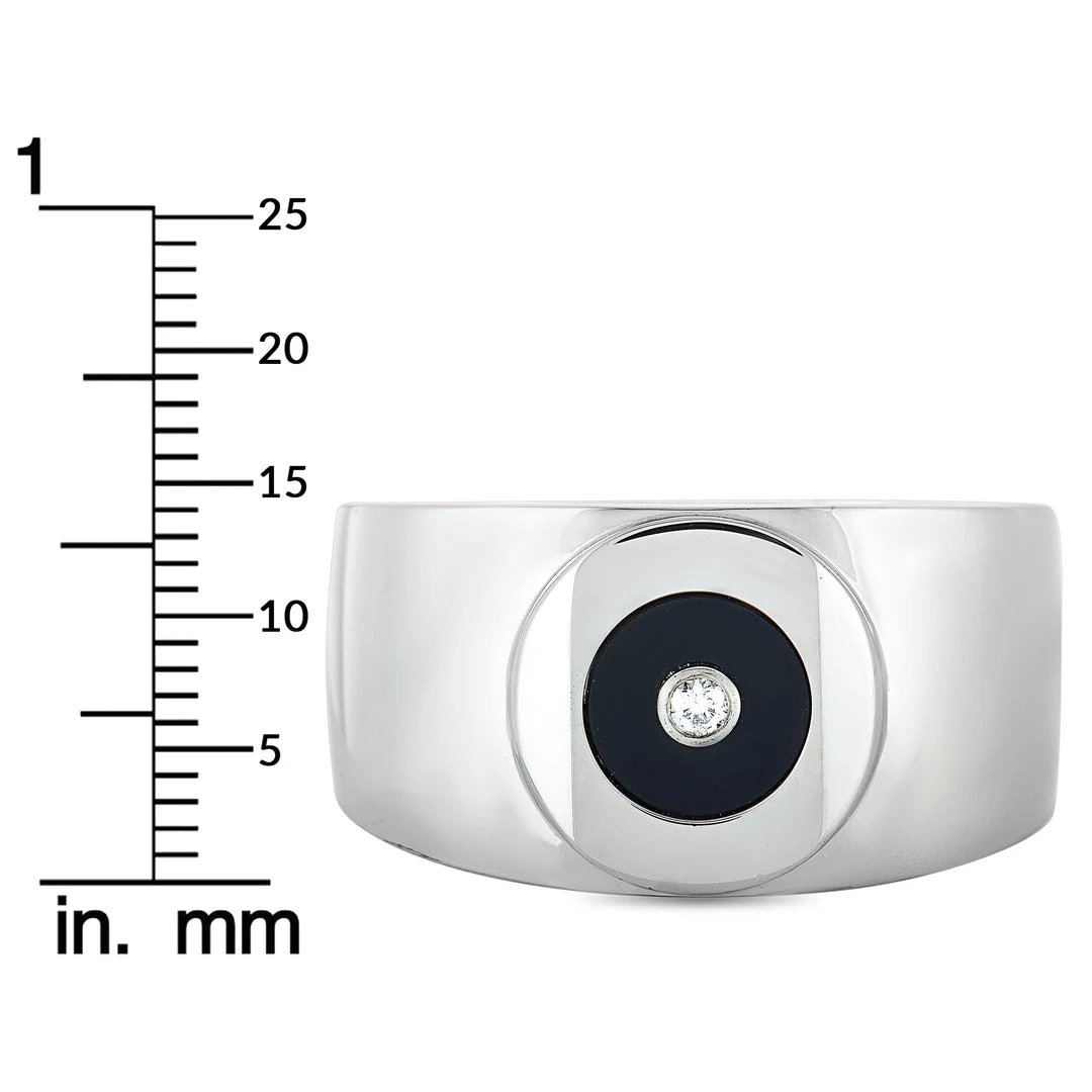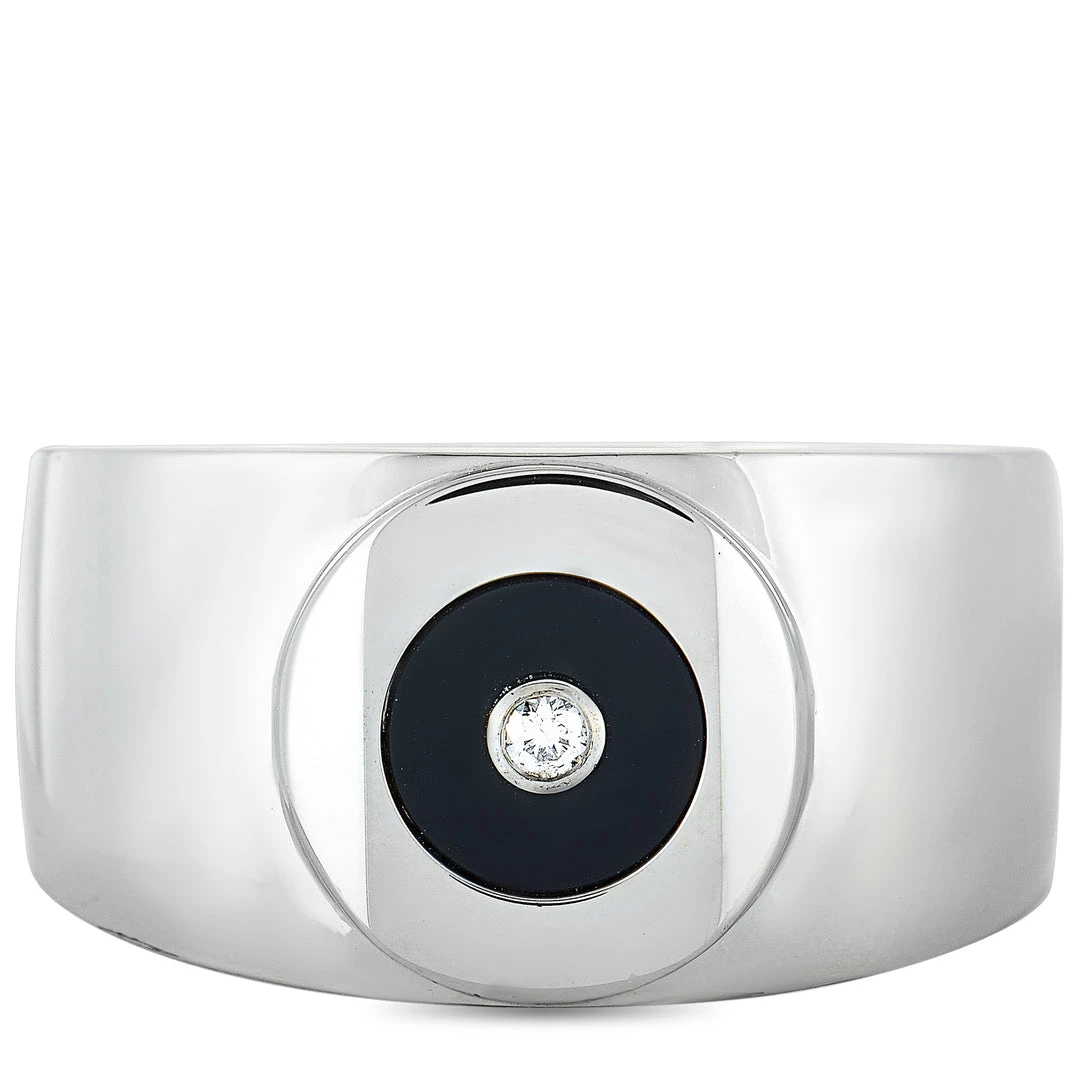 This Charriol ring is crafted from sterling silver and set with onyx and a diamond stone that weighs 0.043 carats. The ring weighs 17.8 grams and boasts band thickness of 8 mm and top height of 3 mm, while top dimensions measure 13 by 14 mm.Offered in brand new condition, this item includes the manufacturerβs box. Ring Size 14