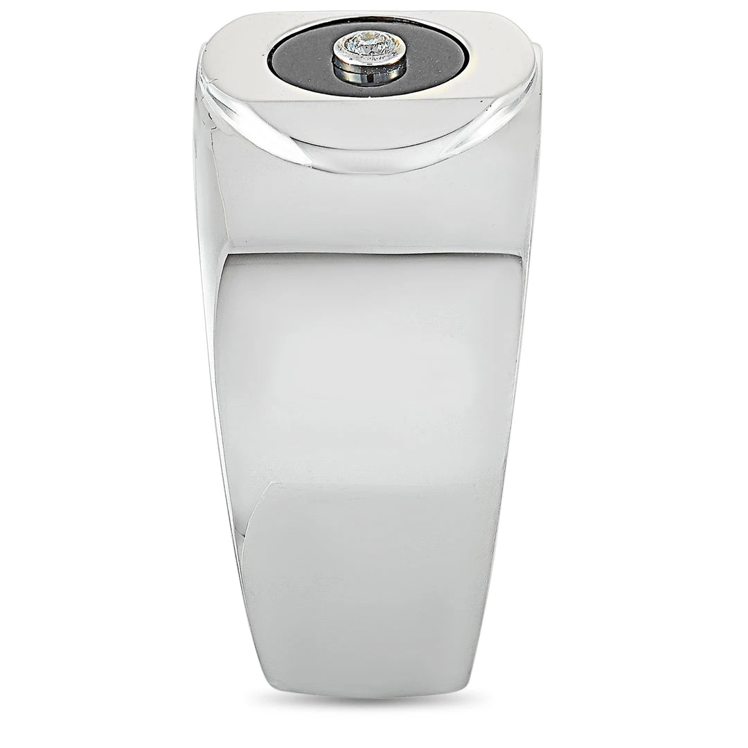 This Charriol ring is crafted from sterling silver and set with onyx and a diamond stone that weighs 0.043 carats. The ring weighs 17.8 grams and boasts band thickness of 8 mm and top height of 3 mm, while top dimensions measure 13 by 14 mm.Offered in brand new condition, this item includes the manufacturerβs box.