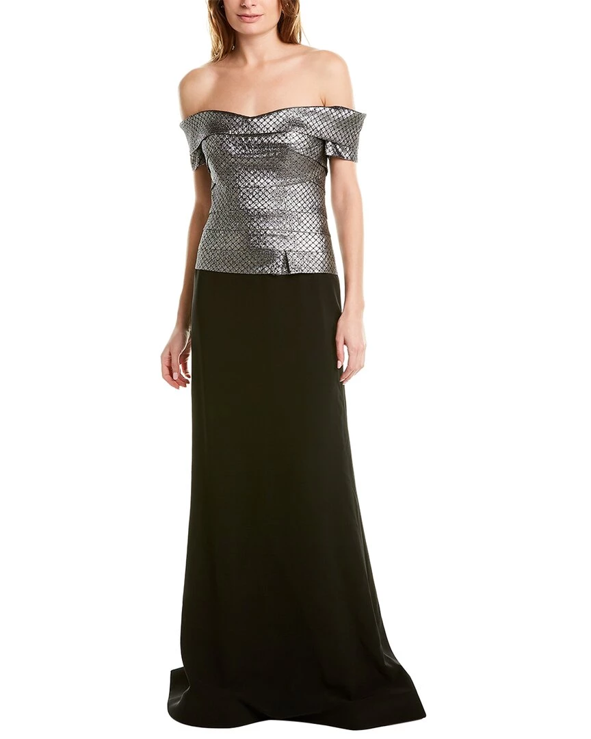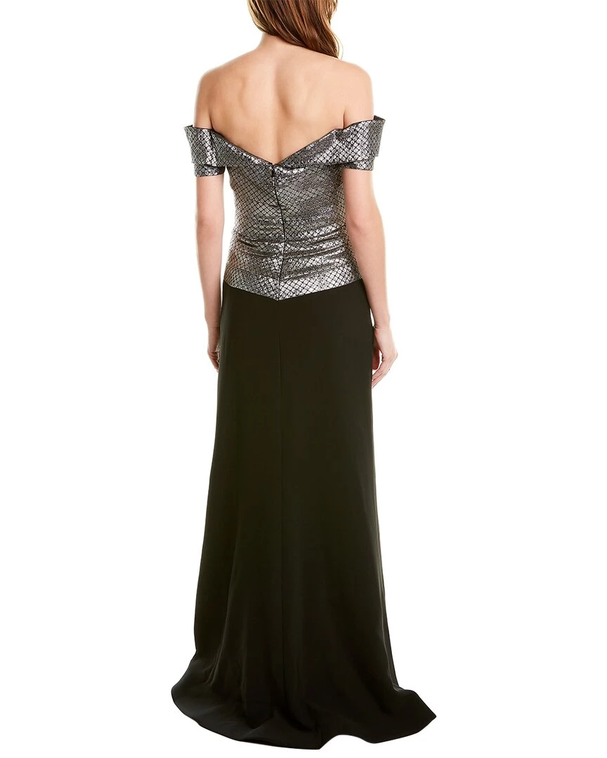 - Design Details – Off-The-Shoulder Neckline, Inner Gripping At Bust, And Metallic Tiered Bodice